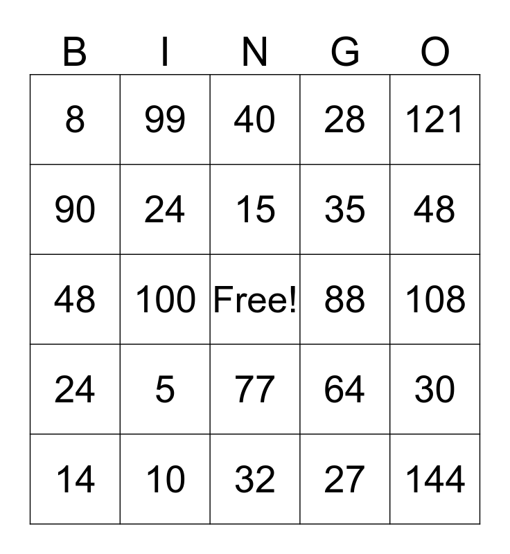 This bingo card has a free space and 24 words: 5, 10, 15, 14, 121, 8, 90, 99, 88, 77, 35, 48, 64, 30, 24, 27, 108, 40, 48, 100, 144, 24, 28 and 32.