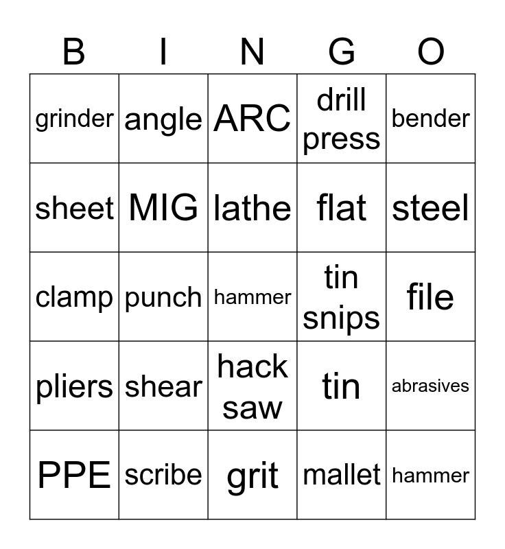 This bingo card has 30 words: scribe, ruler, punch, drill, grinder, ARC, MIG, hack saw, tin snips, grit, file, hammer, mallet, hammer, steel, aluminium, tin, pliers, shear, bender, clamp, tube, angle, flat, sheet, drill press, abrasives, PPE, lathe and soldering iron.
