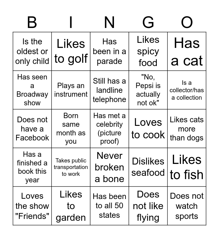 This bingo card has 25 words: Takes public transportation to work, Has been to all 50 states, Still has a landline telephone, Loves the show "Friends", Has a cat, Is the oldest or only child, Has seen a Broadway show, Likes to golf, Loves to cook, Never broken a bone, "No, Pepsi is actually not ok", Does not have a Facebook, Dislikes seafood, Likes to fish, Plays an instrument, Does not watch sports, Likes cats more than dogs, Has been in a parade, Is a collector/has a collection, Born same month as you, Has met a celebrity (picture proof), Likes to garden, Has a finished a book this year, Likes spicy food and Does not like flying.