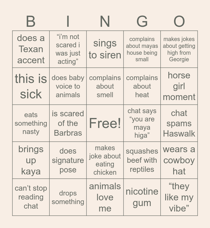 This bingo card has a free space and 24 words: can’t stop reading chat, does signature pose, complains about smell, nicotine gum, makes jokes about getting high from Georgie, does a Texan accent, “i’m not scared i was just acting”, sings to siren, chat says “you are maya higa”, chat spams Haswalk, eats something nasty, does baby voice to animals, squashes beef with reptiles, wears a cowboy hat, this is sick, drops something, animals love me, complains about mayas house being small, horse girl moment, brings up kaya, is scared of the Barbras, makes joke about eating chicken, complains about heat and “they like my vibe”.
