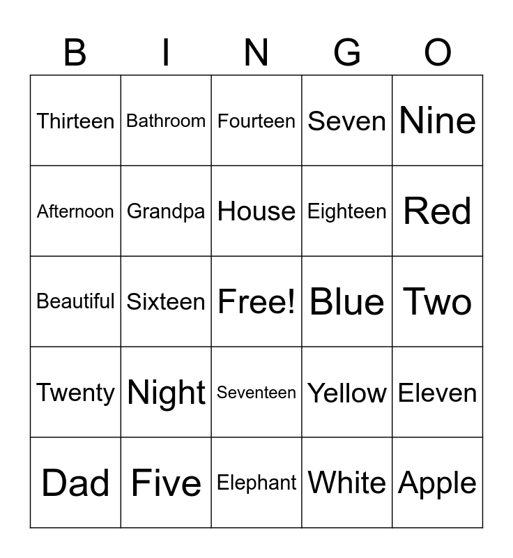This bingo card has a free space and 69 words: One, Two, Three, Four, Five, Six, Seven, Eight, Nine, Ten, Eleven, Twelve, Thirteen, Fourteen, Fifteen, Sixteen, Seventeen, Eighteen, Nineteen, Twenty, Blue, Yellow, Red, Green, Orange, Pink, Brown, Black, White, Bedroom, Bathroom, Kitchen, Living room, Garden, Garage, Hello, Hi, Morning, Afternoon, Evening, Night, Apple, Car, Ball, Mom, Dad, Brother, Sister, Grandma, Grandpa, House, Family, Lion, Elephant, Cat, Dog, Water, Boy, Girl, Beautiful, Ugly, Small, Big, Tall, Short, Old, New, Young and Cellphone.