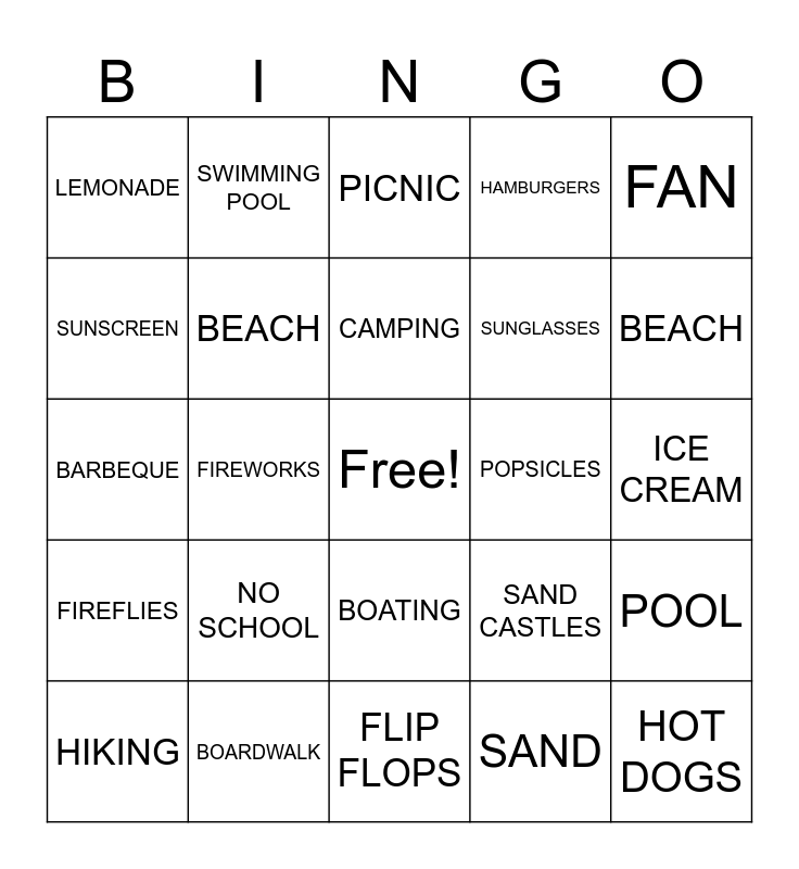 This bingo card has a free space and 40 words: AIR CONDITIONER, BARBEQUE, BATHING SUIT, BEACH, BOARDWALK, BOATING, CAMPING, FISHING, FAN, FIREFLIES, FIREWORKS, HAMBURGERS, HOT DOGS, ICE CREAM, POPSICLES, NO SCHOOL, VACATION, LEMONADE, MOSQUITOS, PICNIC, POOL, SAND, SUNGLASSES, SUNSCREEN, SUNSHINE, VACATION, WATER SKI, JET SKI, JUNE, JULY, AUGUST, HIKING, BIKE RIDES, SAND CASTLES, BEACH, FLIP FLOPS, WATERMELON, SAND CASTLES, SWIMMING POOL and BEACH TOWEL.