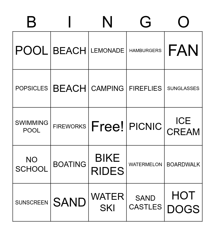 This bingo card has a free space and 38 words: AIR CONDITIONER, BARBEQUE, BATHING SUIT, BEACH, BOARDWALK, BOATING, CAMPING, FISHING, FAN, FIREFLIES, FIREWORKS, HAMBURGERS, HOT DOGS, ICE CREAM, POPSICLES, NO SCHOOL, VACATION, LEMONADE, MOSQUITOS, PICNIC, POOL, SAND, SUNGLASSES, SUNSCREEN, SUNSHINE, WATER SKI, JET SKI, JUNE, JULY, AUGUST, HIKING, BIKE RIDES, SAND CASTLES, BEACH, FLIP FLOPS, WATERMELON, SWIMMING POOL and BEACH TOWEL.