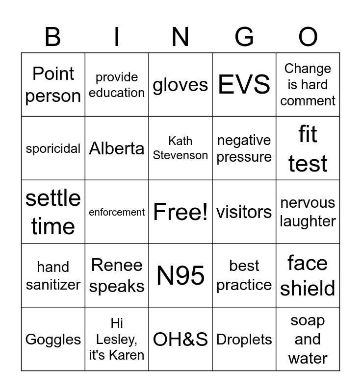 This bingo card has a free space and 24 words: Renee speaks, Hi Lesley, it's Karen, Kath Stevenson, Goggles, Change is hard comment, Point person, sporicidal, provide education, visitors, N95, negative pressure, settle time, best practice, face shield, Alberta, Droplets, nervous laughter, gloves, fit test, enforcement, soap and water, hand sanitizer, EVS and OH&S.