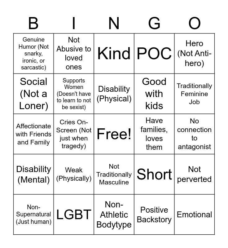 This bingo card has a free space and 24 words: Weak (Physically), LGBT, Disability (Physical), Non-Supernatural (Just human), Hero (Not Anti-hero), Genuine Humor (Not snarky, ironic, or sarcastic), Social (Not a Loner), Not Abusive to loved ones, Have families, loves them, Not Traditionally Masculine, Good with kids, Affectionate with Friends and Family, Short, Not perverted, Supports Women (Doesn't have to learn to not be sexist), Positive Backstory, No connection to antagonist, Kind, Traditionally Feminine Job, Cries On-Screen (Not just when tragedy), Emotional, Disability (Mental), POC and Non-Athletic Bodytype.