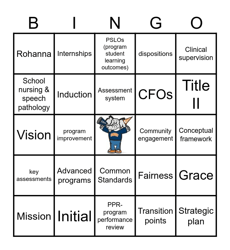 This bingo card has a free space and 26 words: Common Standards, Transition points, Assessment system, Initial, Clinical supervision, Rohanna, School nursing & speech pathology, Internships, Conceptual framework, Fairness, CFOs, Vision, Grace, Mission, program improvement, initial & advanced credential programs, dispositions, key assessments, PSLOs (program student learning outcomes), Strategic plan, Title II, PPR-program performance review, Community engagement, Advanced programs, Induction and Added authorizations.