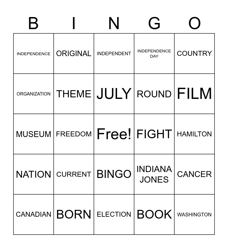 This bingo card has a free space and 29 words: CANADIAN, PRESIDENTIAL, FREEDOM, FREE, INDEPENDENCE, INDEPENDENT, THEME, CURRENT, FIGHT, BORN, HAMILTON, WASHINGTON, ELECTION, BOOK, FILM, PICTURE, BINGO, NATION, COUNTRY, MUSEUM, INDIANA JONES, BASEBALL, ROUND, ORGANIZATION, INDEPENDENCE DAY, ORIGINAL, CANCER, JULY and NOVEL.