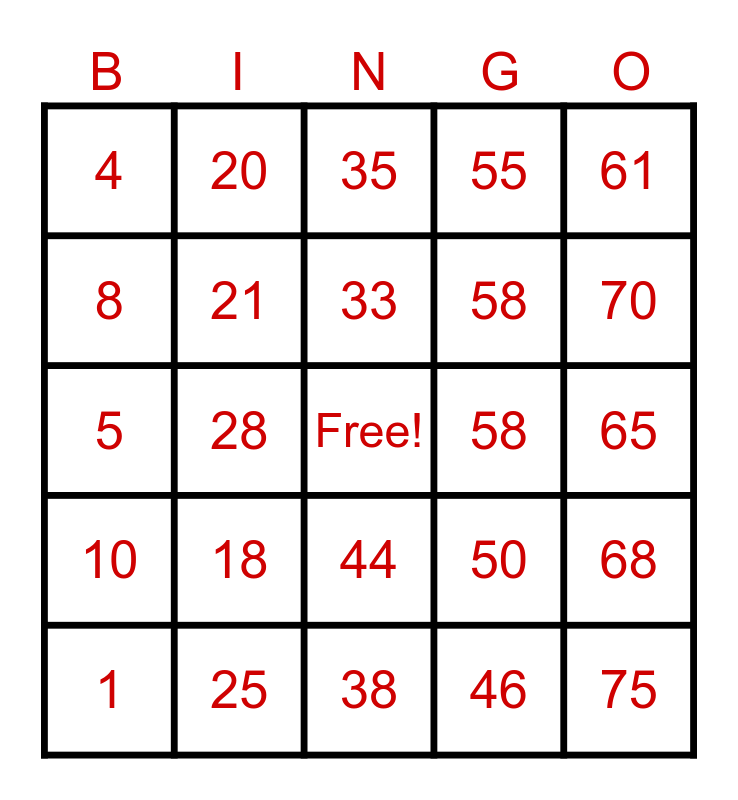 This bingo card has a free space and 24 words: 1, 18, 33, 46, 61, 4, 20, 35, 58, 65, 5, 21, 50, 68, 8, 25, 38, 55, 70, 10, 28, 44, 58 and 75.