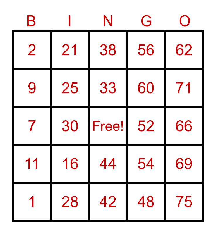 This bingo card has a free space and 24 words: 1, 16, 33, 48, 62, 2, 21, 38, 52, 66, 7, 25, 54, 69, 9, 28, 42, 56, 71, 11, 30, 44, 60 and 75.