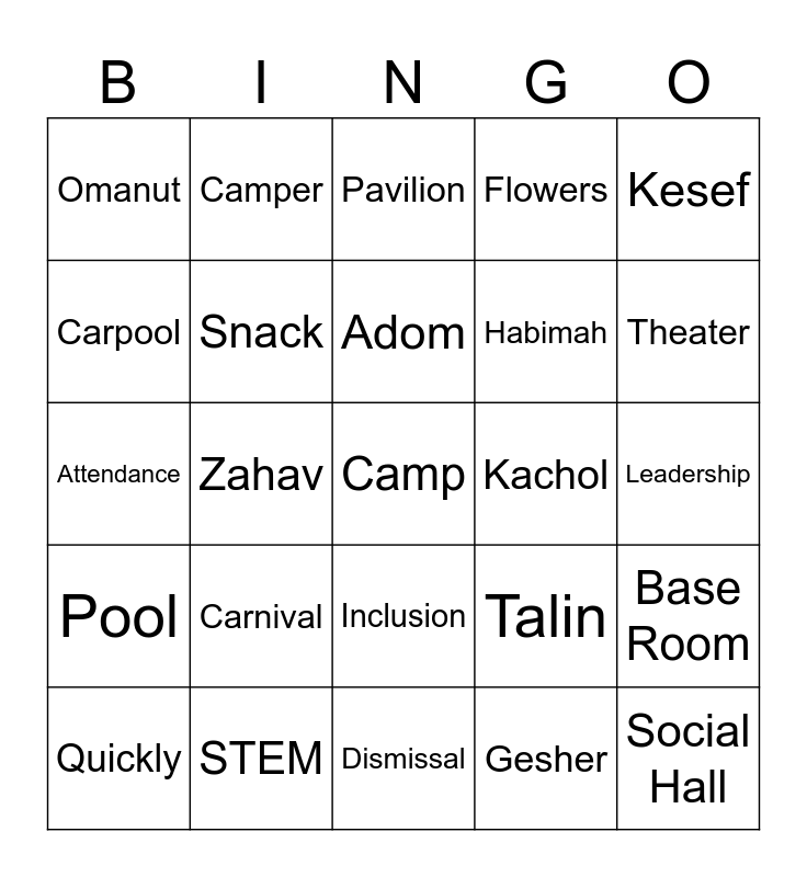 This bingo card has 50 words: Free!, Camp, Arrival, Dismissal, Carnival, Unit, Camper, Counselor, Carpool, Sunset, Snack, Flowers, Base Room, Talin, Panic, Dolphin, Adom, Kachol, Levan, Kesef, Zahav, Gesher, Omanut, Habimah, Macabbiah, Social Hall, Theater, Gallery, Pavilion, Inclusion, Kochavim, Participation, Field Trip, Music, STEM, Art, Dance, Sports, Gaga, Leadership, Shabbat, Sunscreen, Water, Specialist, Quickly, Attendance, Count, Lunch, Pool and Locker Room.