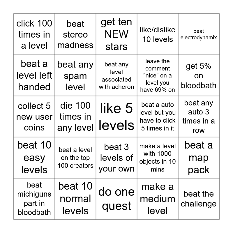 This bingo card has a free space and 27 words: make a level with 1000 objects in 10 mins, beat polargiest, leave the comment "nice" on a level you have 69% on, do one quest, beat a level left handed, get ten NEW stars, beat stereo madness, beat 10 easy levels, beat a auto level but you have to click 5 times in it, beat a map pack, collect 5 new user coins, like/dislike 10 levels, beat michiguns part in bloodbath, beat 10 normal levels, get 5% on bloodbath, beat one new demon, beat any spam level, beat any level associated with acheron, beat a level on the top 100 creators, click 100 times in a level, beat any auto 3 times in a row, make a medium level, die 100 times in any level, beat the challenge, beat 3 levels of your own, beat electrodynamix and beat 10 harder levels.