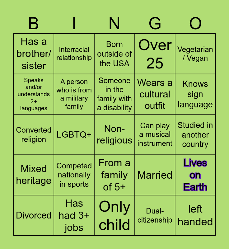 This bingo card has 26 words: From a family of 5+, Dual-citizenship, Someone in the family with a disability, Has had 3+ jobs, Vegetarian / Vegan, Has a brother/ sister, Speaks and/or understands 2+ languages, Interracial relationship, Studied in another country, Married, Wears a cultural outfit, Converted religion, Lives on Earth, Divorced, LGBTQ+, Partner from another culture, Over 25, Mixed heritage, Born outside of the USA, Non-religious, Knows sign language, Only child, Can play a musical instrument, Competed nationally in sports, A person who is from a military family and left handed.