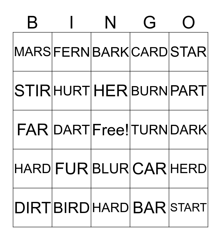 This bingo card has a free space and 24 words: FUR, BIRD, HER, DIRT, STAR, MARS, STIR, FERN, TURN, BLUR, BURN, FAR, CAR, HERD, HURT, BAR, DARK, BARK, PART, DART, START, HARD, CARD and HARD.