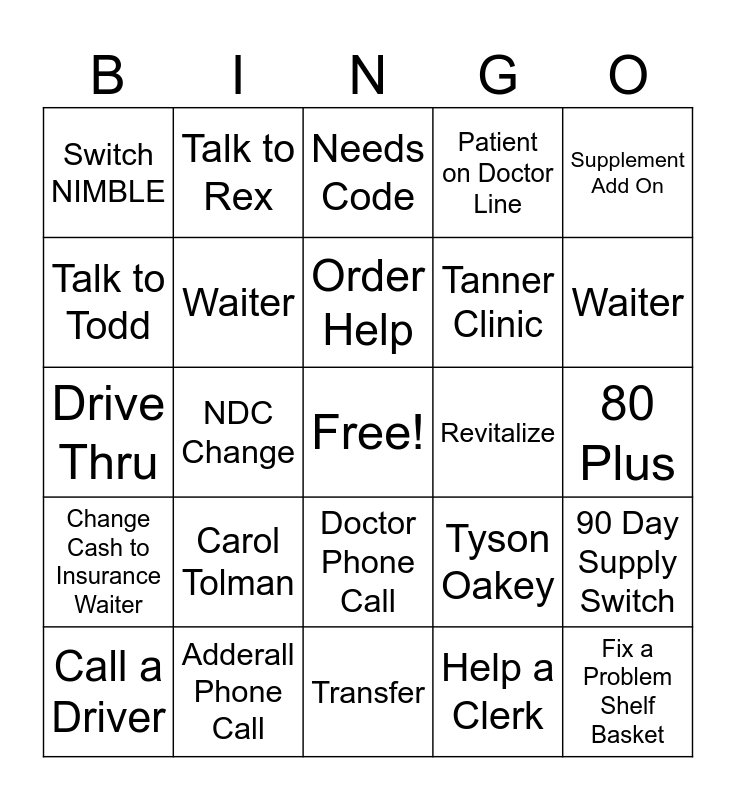 This bingo card has a free space and 24 words: Carol Tolman, Adderall Phone Call, Order Help, Call a Driver, Supplement Add On, Switch NIMBLE, Talk to Todd, Talk to Rex, Revitalize, Doctor Phone Call, Tanner Clinic, Drive Thru, Tyson Oakey, 90 Day Supply Switch, Waiter, Help a Clerk, 80 Plus, Needs Code, Waiter, NDC Change, Fix a Problem Shelf Basket, Change Cash to Insurance Waiter, Patient on Doctor Line and Transfer.