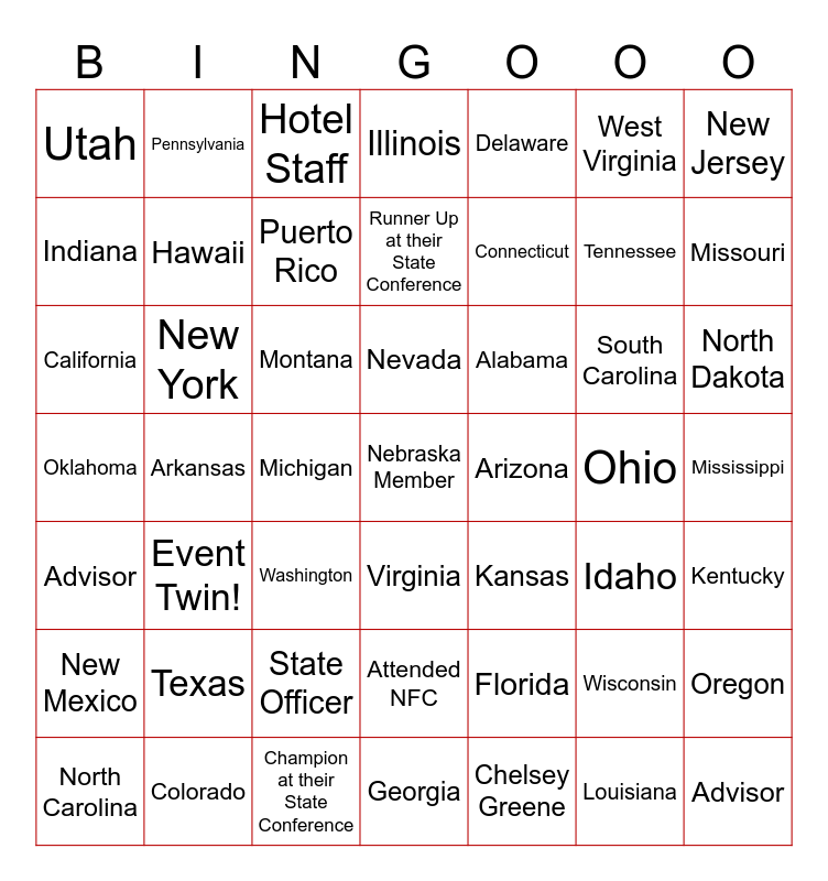 This bingo card has a free space and 48 words: Florida, Tennessee, Georgia, Arkansas, Montana, Mississippi, Pennsylvania, Colorado, West Virginia, Virginia, New Jersey, Illinois, South Carolina, Alabama, New Mexico, Ohio, Indiana, Missouri, Wisconsin, Delaware, Connecticut, Michigan, Utah, Hawaii, Oregon, Puerto Rico, North Dakota, North Carolina, Nevada, New York, Louisiana, Arizona, Kentucky, Texas, Oklahoma, Kansas, Idaho, California, Washington, State Officer, Advisor, Advisor, Hotel Staff, Champion at their State Conference, Runner Up at their State Conference, Attended NFC, Event Twin! and Chelsey Greene.