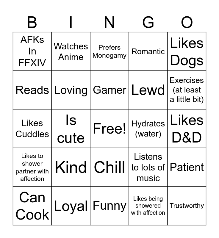 This bingo card has a free space and 24 words: Kind, Loyal, Gamer, Can Cook, Likes Dogs, AFKs In FFXIV, Reads, Watches Anime, Hydrates (water), Chill, Lewd, Likes Cuddles, Listens to lots of music, Patient, Loving, Likes being showered with affection, Likes D&D, Prefers Monogamy, Exercises (at least a little bit), Is cute, Trustworthy, Likes to shower partner with affection, Romantic and Funny.