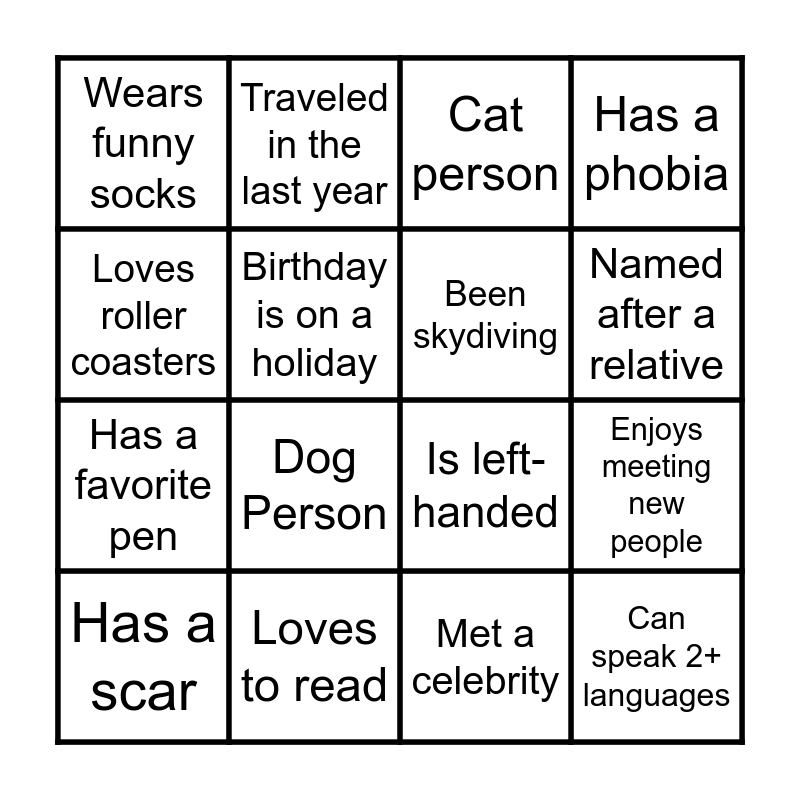This bingo card has 24 words: Has more than 5 tattoos, Fostered or adopted a child, Named after a relative, Likes pineapple on pizza, Loves roller coasters, Wears funny socks, Birthday is on a holiday, Traveled in the last year, Loves to read, Can drive stick, Has a favorite pen, Is left-handed, Had broken a bone, Never flown on an airplane, Been skydiving, Has taken a cruise, Met a celebrity, Cat person, Dog Person, Enjoys meeting new people, Has a scar, Can speak 2+ languages, Has a phobia and Collects something.