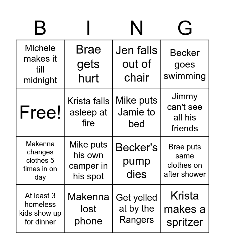This bingo card has 16 words: Makenna lost phone, Brae puts same clothes on after shower, Jen falls out of chair, Michele makes it till midnight, Makenna changes clothes 5 times in on day, Brae gets hurt, Becker's pump dies, Get yelled at by the Rangers, Free!, Krista falls asleep at fire, At least 3 homeless kids show up for dinner, Becker goes swimming, Mike puts his own camper in his spot, Jimmy can't see all his friends, Mike puts Jamie to bed and Krista makes a spritzer.