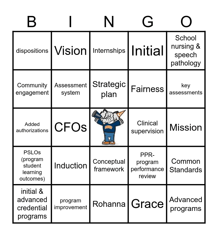 This bingo card has a free space and 25 words: Induction, Rohanna, Strategic plan, initial & advanced credential programs, School nursing & speech pathology, dispositions, Community engagement, Vision, Clinical supervision, Conceptual framework, Fairness, Added authorizations, PPR-program performance review, Common Standards, Assessment system, Transition points, Mission, Internships, key assessments, CFOs, Advanced programs, program improvement, PSLOs (program student learning outcomes), Initial and Grace.