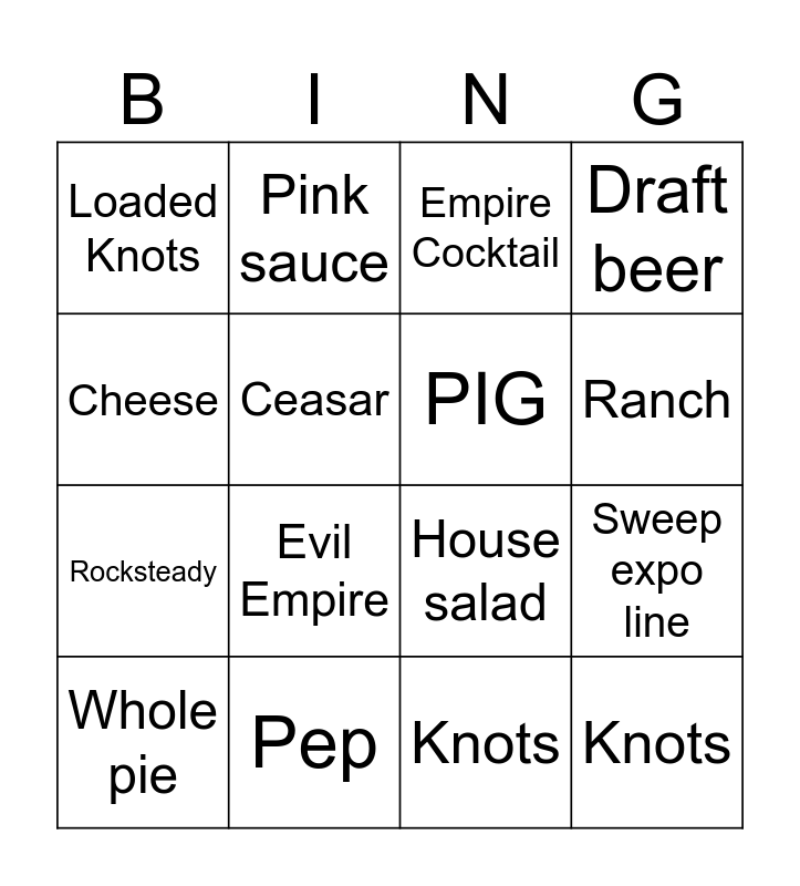 This bingo card has 17 words: Knots, Whole pie, Empire Cocktail, Loaded Knots, Evil Empire, Draft beer, Sweep expo line, PIG, Ranch, Ceasar, Pep, House salad, Cheese, Pink sauce, Rocksteady, Clean under cushions and Knots.