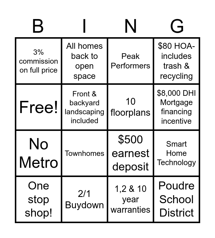 This bingo card has 16 words: 2/1 Buydown, Smart Home Technology, Peak Performers, 3% commission on full price, No Metro, All homes back to open space, $500 earnest deposit, 1,2 & 10 year warranties, Free!, Front & backyard landscaping included, One stop shop!, $80 HOA- includes trash & recycling, Townhomes, $8,000 DHI Mortgage financing incentive, 10 floorplans and Poudre School District.