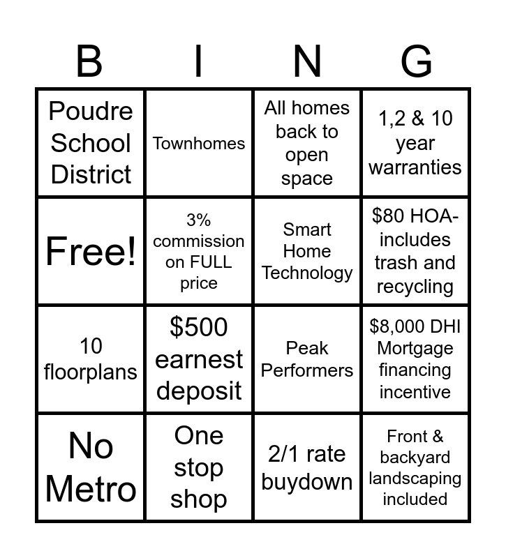 This bingo card has 16 words: One stop shop, $8,000 DHI Mortgage financing incentive, All homes back to open space, Poudre School District, 10 floorplans, Townhomes, Peak Performers, 2/1 rate buydown, Free!, 3% commission on FULL price, No Metro, 1,2 & 10 year warranties, $500 earnest deposit, $80 HOA- includes trash and recycling, Smart Home Technology and Front & backyard landscaping included.