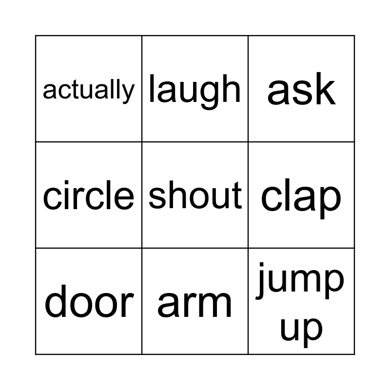 This bingo card has 30 words: do, weekend, really, fun, actually, ask, door, say, hear, knock, answer, guitar, can, be going to, play, way, wave, step, spin, shout, ready, onstage, laugh, jump up, clap, circle, behind, beat, arm and follow.