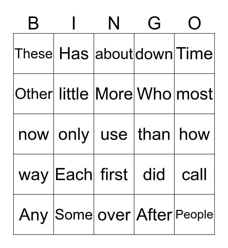 This bingo card has a free space and 24 words: Each, Some, More, Any, Time, These, Other, Has, than, first, Who, now, did, call, little, After, how, about, most, only, People, way, down and over.