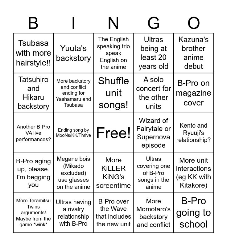 This bingo card has a free space and 24 words: Megane bois (Mikado excluded) use glasses on the anime, Ultras having a rivalry relationship with B-Pro, Shuffle unit songs!, More Teramitsu Twins arguments! Maybe from the game *wink*, Kazuna's brother anime debut, Tsubasa with more hairstyle!!, Tatsuhiro and Hikaru backstory, Yuuta's backstory, Wizard of Fairytale or Supernova episode, More KiLLER KiNG's screentime, A solo concert for the other units, Another B-Pro VA live performances?, Ultras covering one of B-Pro songs in the anime, More unit interactions (eg KK with Kitakore), More backstory and conflict ending for Yashamaru and Tsubasa, More Momotaro's backstory and conflict, Kento and Ryuuji's relationship?, The English speaking trio speak English on the anime, B-Pro on magazine cover, Ending song by MooNs/KK/Thrive, B-Pro going to school, B-Pro aging up, please. I'm begging you, Ultras being at least 20 years old and B-Pro over the Wave that includes the new unit.