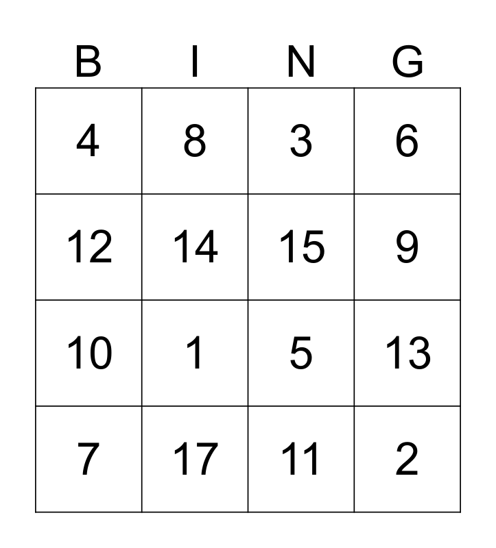 This bingo card has 18 words: 1, 2, 3, 4, 5, 6, 7, 8, 9, 10, 11, 12, 13, 14, 15, 16, 17 and 18.