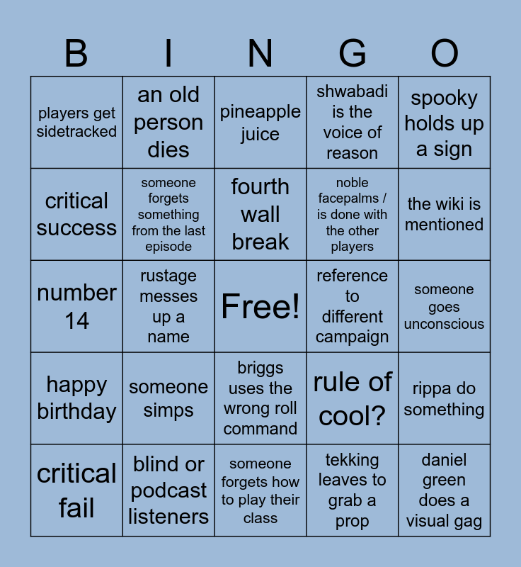This bingo card has a free space and 29 words: critical fail, rustage almost dies laughing, rustage messes up a name, code briggs, players get sidetracked, pineapple juice, someone forgets something from the last episode, someone simps, reference to different campaign, blind or podcast listeners, someone goes unconscious, daniel green does a visual gag, someone forgets how to play their class, tekking leaves to grab a prop, the wiki is mentioned, internet problems, briggs uses the wrong roll command, happy birthday, spooky holds up a sign, number 14, rule of cool?, someone takes a bathroom break, noble facepalms / is done with the other players, critical success, shwabadi is the voice of reason, an old person dies, rippa do something, fourth wall break and rustage says how lucky the players are.
