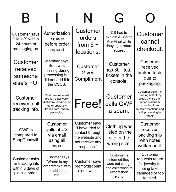 This bingo card has a free space and 24 words: Customer yells at CS via email using all caps., Customer says “Where is my order/item?” with no additional info., Customer Gives Compliment, Customer asks for tracking info within 3 days of placing order., Customer cannot checkout., Customer says “Hello?” within 24 hours of messaging us., Customer received someone else’s FO., Authorization expired before order shipped., Customer calls GWF a scam., Customer says “I have tried to contact through the website and not receive any response.”, Customer has 30+ total tickets in the console., Customer received null tracking info., Clothing was listed on the site in the wrong size., Customer receives packing slip with notes written on it., Member says item was missing during processing but did not add it to the CSCS., Customer is informed they were not charge and asks when to expect their refund., Customer says “I’m missing half of my order.”, while their order is actually sourcing from multiple locations and still processing/in transit., Customer orders from 6 + locations., Customer received broken tech, due to packaging., Customer received broken glassware, dishware, ceramic, or other obviously fragile item, due to packaging., Customer requests return for jewelry for being fake, damaged or too tangled., GWF is compared to ShopGoodwill., CS has to explain All Sales Are Final while denying a return request. and Customer says promo/discount didn’t work..