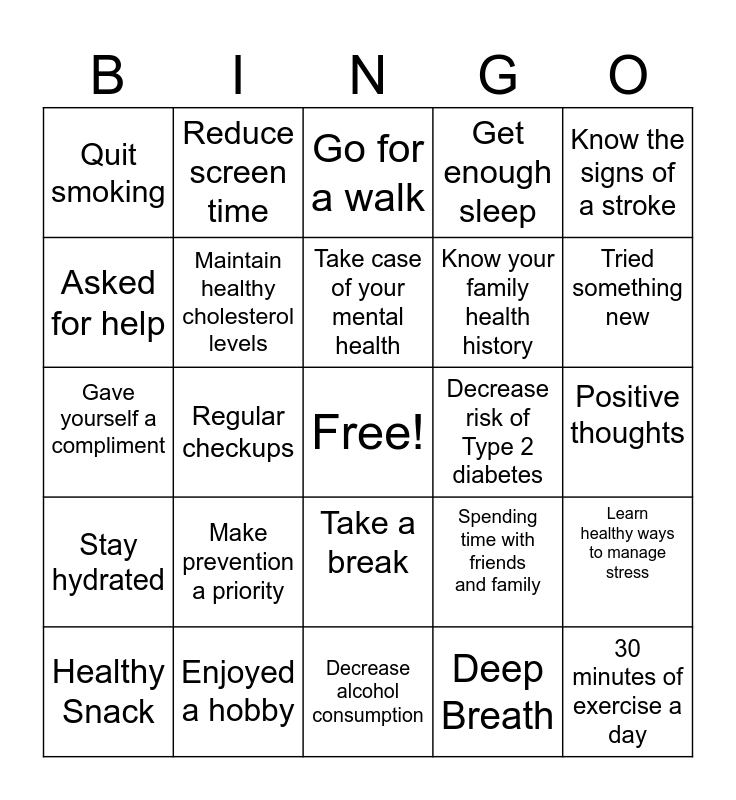 This bingo card has a free space and 24 words: Healthy Snack, Make prevention a priority, Take case of your mental health, Deep Breath, Know the signs of a stroke, Quit smoking, Reduce screen time, Go for a walk, Decrease risk of Type 2 diabetes, Positive thoughts, Gave yourself a compliment, Maintain healthy cholesterol levels, Spending time with friends and family, Learn healthy ways to manage stress, Asked for help, Enjoyed a hobby, Decrease alcohol consumption, Get enough sleep, Tried something new, Stay hydrated, Regular checkups, Take a break, Know your family health history and 30 minutes of exercise a day.