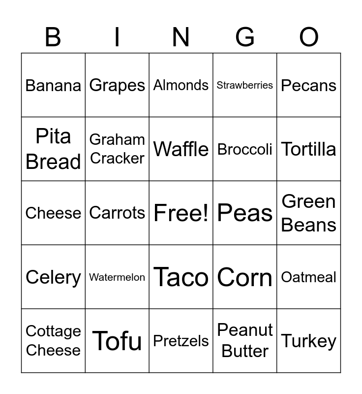 This bingo card has a free space and 34 words: Bagel, Peanut Butter, Yogurt, Kiwi, Celery, Graham Cracker, Pecans, Cottage Cheese, Grapes, Asparagus, Waffle, Almonds, Milk, Raisins, Peas, Tortilla, Tofu, Cheese, Watermelon, Corn, Taco, Spaghetti Noodles, Banana, Green Beans, Pretzels, Turkey, Strawberries, Chicken Noodle Soup, Broccoli, Pita Bread, Apples, Carrots, Oatmeal and Beans.