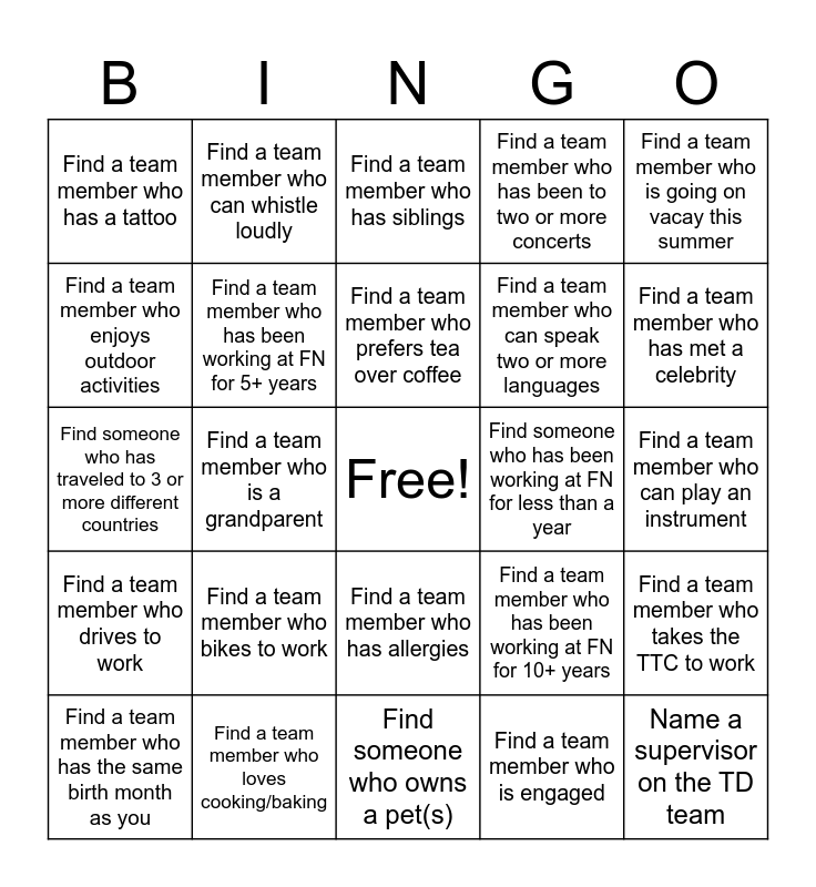 This bingo card has a free space and 31 words: Find someone who owns a pet(s), Find someone who has two children or more, Find a team member who is a grandparent, Find a team member who recently came back from vacation, Find a team member who has a tattoo, Find a team member who has siblings, Find a team member who has been working at FN for 5+ years, Find a team member who has been working at FN for 10+ years, Find someone who has been working at FN for less than a year, Find a team member who is engaged, Find a team member who can play an instrument, Name a supervisor on the TD team, Name a supervisor on the FN team, Find a team member who plays a sport in their free time, Find a team member who has met a celebrity, Find a team member who takes the GO train to work, Find a team member who takes the TTC to work, Find a team member who bikes to work, Find a team member who drives to work, Find a team member who has allergies, Find a team member who is going on vacay this summer, Find a team member who has 20/20 vision, Find a team member who has the same birth month as you, Find a team member who can whistle loudly, Find a team member who can speak two or more languages, Find a team member who enjoys outdoor activities, Find a team member who has been to two or more concerts, Find someone who has traveled to 3 or more different countries, Find a team member who loves cooking/baking, Find a team member who prefers tea over coffee and Find a team member who has done the CN Tower Edge walk.