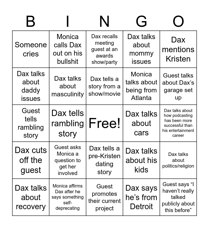 This bingo card has a free space and 24 words: Dax talks about recovery, Guest asks Monica a question to get her involved, Dax tells a story from a show/movie, Dax says he’s from Detroit, Dax mentions Kristen, Someone cries, Monica calls Dax out on his bullshit, Dax recalls meeting guest at an awards show/party, Dax talks about cars, Dax talks about how podcasting has been more successful than his entertainment career, Guest tells rambling story, Dax talks about masculinity, Dax talks about his kids, Dax talks about politics/religion, Dax talks about daddy issues, Monica affirms Dax after he says something self-deprecating, Guest promotes their current project, Dax talks about mommy issues, Guest talks about Dax’s garage set up, Dax cuts off the guest, Dax tells rambling story, Dax tells a pre-Kristen dating story, Monica talks about being from Atlanta and Guest says “I haven’t really talked publicly about this before”.