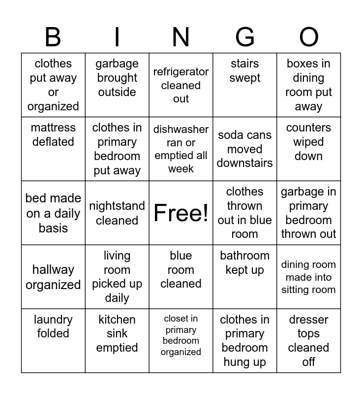 This bingo card has a free space and 24 words: living room picked up daily, kitchen sink emptied, dishwasher ran or emptied all week, laundry folded, boxes in dining room put away, clothes put away or organized, mattress deflated, garbage brought outside, clothes thrown out in blue room, blue room cleaned, soda cans moved downstairs, bed made on a daily basis, bathroom kept up, dining room made into sitting room, clothes in primary bedroom put away, clothes in primary bedroom hung up, garbage in primary bedroom thrown out, refrigerator cleaned out, counters wiped down, nightstand cleaned, dresser tops cleaned off, hallway organized, stairs swept and closet in primary bedroom organized.