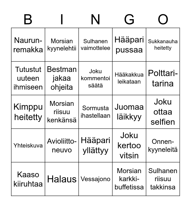This bingo card has 29 words: Kaaso kiiruhtaa, Joku räplää puhelinta, Morsian riisuu kenkänsä, Sulhanen riisuu takkinsa, Naurun-remakka, Sulhanen vaimottelee, Bestman jakaa ohjeita, Avioliitto-neuvo, Juomaa läikkyy, Halaus, Joku ottaa selfien, Sormusta ihastellaan, Vessajono, Morsian karkki-buffetissa, Polttari-tarina, Joku kirjoittaa vieraskirjaan, Hääpari yllättyy, Yhteiskuva, Sukkanauha heitetty, Kimppu heitetty, Joku kertoo vitsin, Häätanssi tanssittu, Hääkakkua leikataan, Tutustut uuteen ihmiseen, Hääpari pussaa, Morsian kyynelehtii, Onnen-kyyneleitä, Joku kommentoi säätä and Ruokaa kehutaan.
