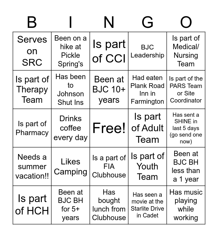 This bingo card has a free space and 24 words: Likes Camping, Been at BJC BH for 5+ years, Been at BJC 10+ years, Is part of HCH, Is part of Medical/ Nursing Team, Serves on SRC, Is part of Therapy Team, Been on a hike at Pickle Spring's, Is part of Adult Team, Is a part of FIA Clubhouse, Had eaten Plank Road Inn in Farmington, Is part of Pharmacy, Is part of Youth Team, Been at BJC BH less than a 1 year, Has been to Johnson Shut Ins, Has seen a movie at the Starlite Drive in Cadet, Has sent a SHINE in last 5 days (go send one now), Is part of CCI, Is part of the PARS Team or Site Coordinator, Drinks coffee every day, Has music playing while working, Needs a summer vacation!!, BJC Leadership and Has bought lunch from Clubhouse.