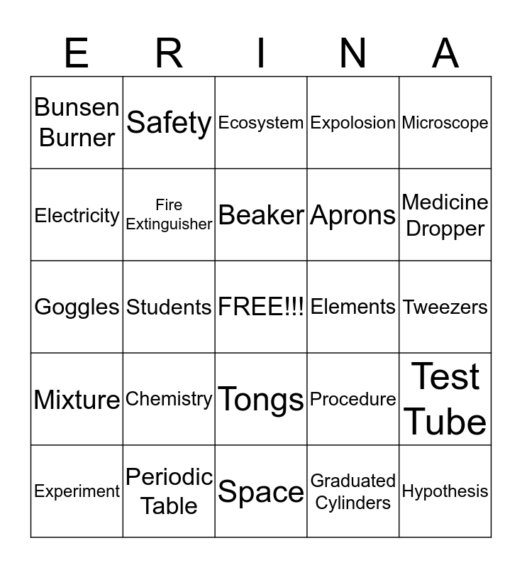 This bingo card has a free space and 24 words: Chemistry, Periodic Table, Beaker, Experiment, Microscope, Bunsen Burner, Electricity, Safety, Elements, Tongs, Aprons, Goggles, Procedure, Test Tube, Fire Extinguisher, Graduated Cylinders, Tweezers, Ecosystem, Medicine Dropper, Students, Hypothesis, Mixture, Expolosion and Space.