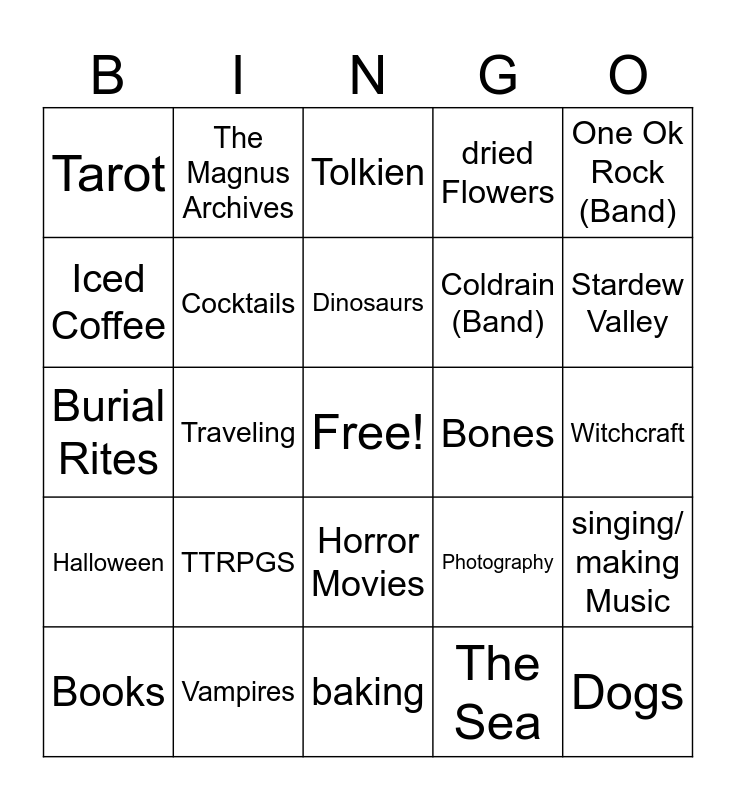 This bingo card has a free space and 24 words: TTRPGS, Vampires, Dinosaurs, Books, One Ok Rock (Band), Tarot, Iced Coffee, The Magnus Archives, Bones, Horror Movies, Coldrain (Band), Burial Rites, Photography, singing/ making Music, Cocktails, The Sea, Witchcraft, Tolkien, Stardew Valley, Traveling, Dogs, Halloween, dried Flowers and baking.