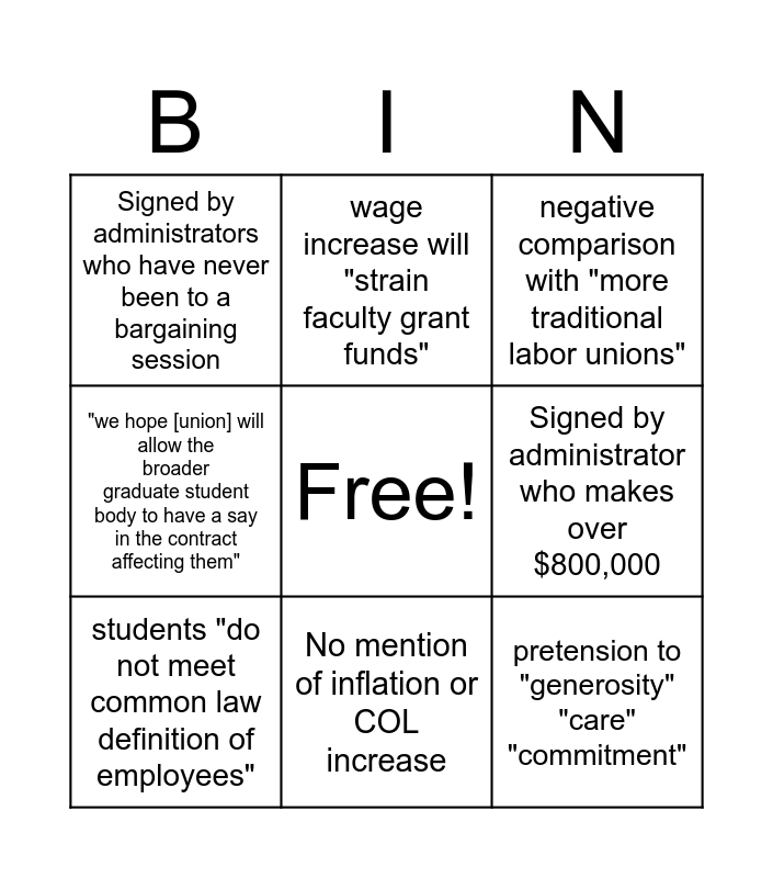 This bingo card has a free space and 8 words: Signed by administrator who makes over $800,000, negative comparison with "more traditional labor unions", wage increase will "strain faculty grant funds", students "do not meet common law definition of employees", Signed by administrators who have never been to a bargaining session, pretension to "generosity" "care" "commitment", "we hope [union] will allow the broader graduate student body to have a say in the contract affecting them" and No mention of inflation or COL increase.