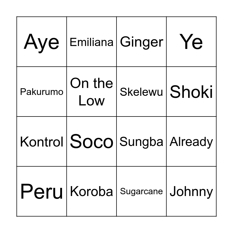 This bingo card has 61 words: Dami Duro, Woju, Ojuelegba, Johnny, One dance, Collabo, Skelewu, Mama, Kontrol, FIA, Ye, Eminado, On the Low, Oleku, Caro, Aye, Peru, Pakurumo, Gobe, Shoki, Koroba, Ginger, Case, Joro, System, Ja ara e, Dumebi, Woman, Soco, Don't rush, Monalisa, High, Killin dem, No Wahala, Emiliana, B. D'OR, No Lele, Already, Finesse, Sungba, Omo Ope, Last Last, Sugarcane, Buga, 1er Gaou, Palazzo, Adonai, It's Plenty, Dangote, Don't dull, Ku lo sa, Leg Over, Anybody, Electricity, Ototo, Joha, Rush, Won da Mo, Holiday, Sability and Amapiano.