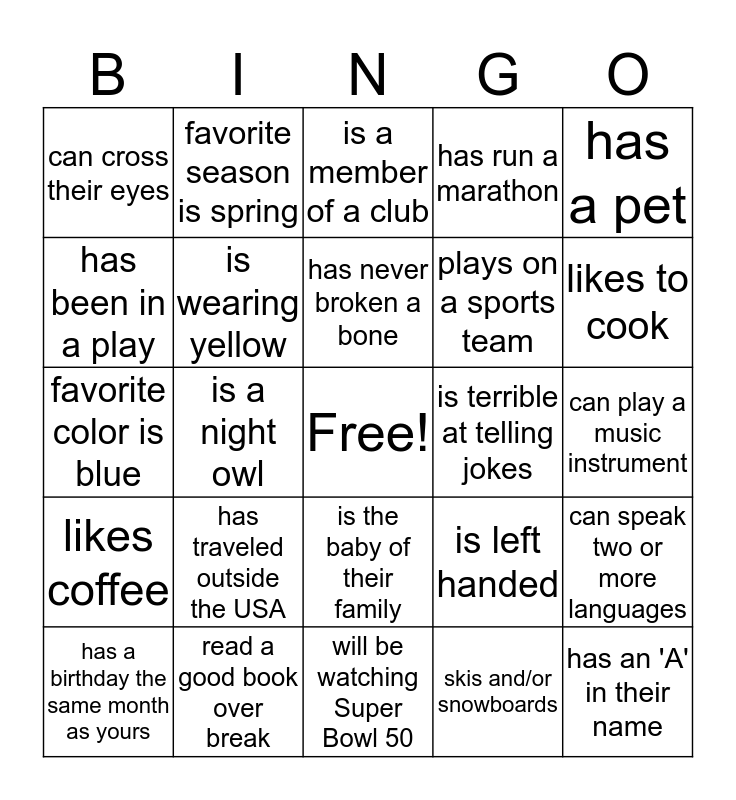 This bingo card has a free space and 24 words: has traveled outside the USA, read a good book over break, has never broken a bone, has a birthday the same month as yours, has a pet, can cross their eyes, has been in a play, favorite season is spring, is terrible at telling jokes, is the baby of their family, plays on a sports team, favorite color is blue, is left handed, can speak two or more languages, is wearing yellow, skis and/or snowboards, can play a music instrument, is a member of a club, likes to cook, is a night owl, has an 'A' in their name, likes coffee, has run a marathon and will be watching Super Bowl 50.