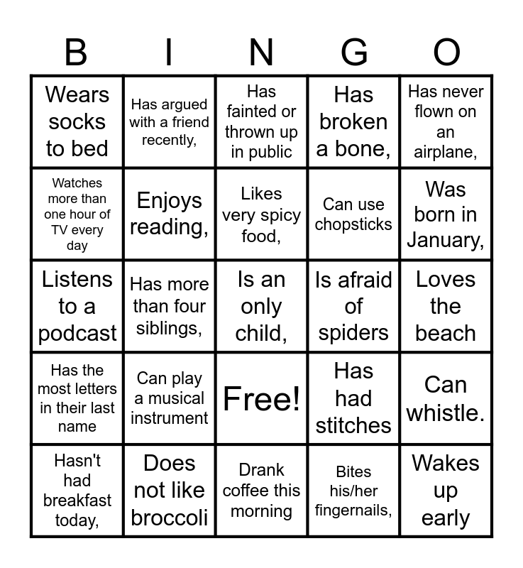 This bingo card has 26 words: Free!, Hasn't had breakfast today,, Enjoys reading,, Has won a contest,, Has broken a bone,, Has never flown on an airplane,, Watches more than one hour of TV every day, Has argued with a friend recently,, Likes very spicy food,, Bites his/her fingernails,, Was born in January,, Listens to a podcast, Does not like broccoli, Drank coffee this morning, Is afraid of spiders, Wakes up early, Wears socks to bed, Can play a musical instrument, Has fainted or thrown up in public, Has had stitches, Loves the beach, Has the most letters in their last name, Has more than four siblings,, Is an only child,, Can use chopsticks and Can whistle..