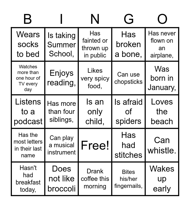 This bingo card has 26 words: Free!, Hasn't had breakfast today,, Enjoys reading,, Has won a contest,, Has broken a bone,, Has never flown on an airplane,, Watches more than one hour of TV every day, Is taking Summer School,, Likes very spicy food,, Bites his/her fingernails,, Was born in January,, Listens to a podcast, Does not like broccoli, Drank coffee this morning, Is afraid of spiders, Wakes up early, Wears socks to bed, Can play a musical instrument, Has fainted or thrown up in public, Has had stitches, Loves the beach, Has the most letters in their last name, Has more than four siblings,, Is an only child,, Can use chopsticks and Can whistle..