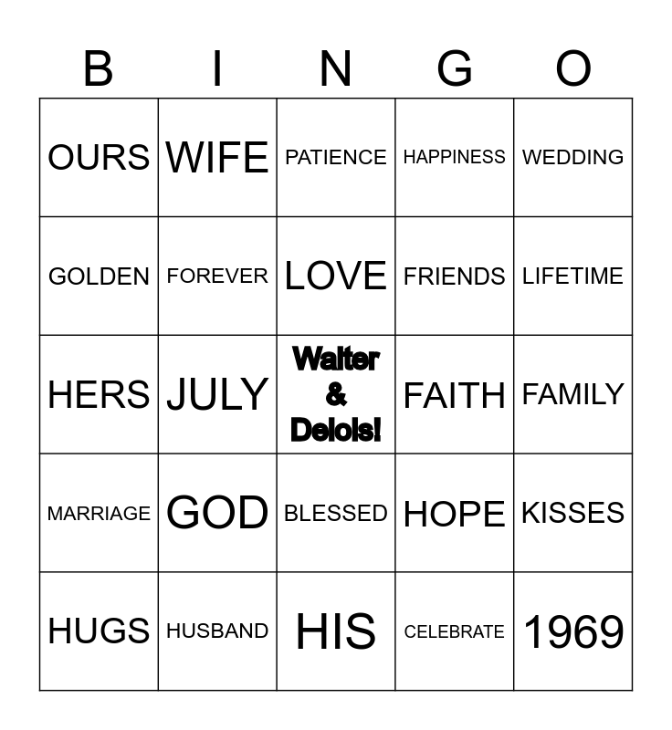 This bingo card has a free space and 24 words: HUGS, GOD, LOVE, CELEBRATE, WEDDING, OURS, WIFE, PATIENCE, FAITH, FAMILY, HERS, FOREVER, HOPE, KISSES, GOLDEN, HUSBAND, HIS, HAPPINESS, LIFETIME, MARRIAGE, JULY, BLESSED, FRIENDS and 1969.