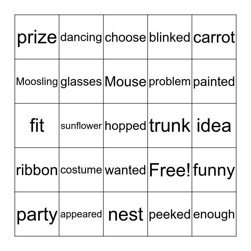 This bingo card has 25 words: costume, nest, Mouse, party, carrot, prize, Moosling, dancing, trunk, wanted, problem, fit, Free!, funny, glasses, enough, idea, choose, painted, sunflower, hopped, appeared, ribbon, blinked and peeked.