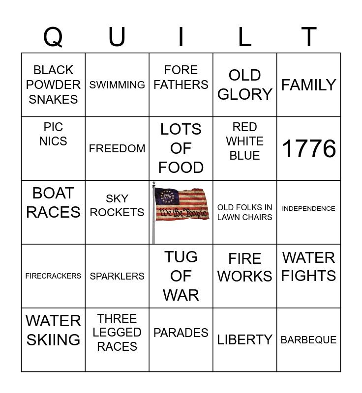 This bingo card has a free space and 24 words: SPARKLERS, THREE LEGGED RACES, LOTS OF FOOD, WATER SKIING, FAMILY, BLACK POWDER SNAKES, PIC NICS, SWIMMING, OLD FOLKS IN LAWN CHAIRS, TUG OF WAR, RED WHITE BLUE, BOAT RACES, FIRE WORKS, WATER FIGHTS, FREEDOM, LIBERTY, INDEPENDENCE, FORE FATHERS, 1776, SKY ROCKETS, BARBEQUE, FIRECRACKERS, OLD GLORY and PARADES.