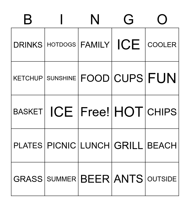 This bingo card has a free space and 24 words: PICNIC, SUMMER, FOOD, GRASS, COOLER, DRINKS, KETCHUP, HOTDOGS, HOT, LUNCH, CUPS, BASKET, GRILL, BEACH, SUNSHINE, ANTS, CHIPS, FAMILY, FUN, ICE, OUTSIDE, PLATES, ICE and BEER.